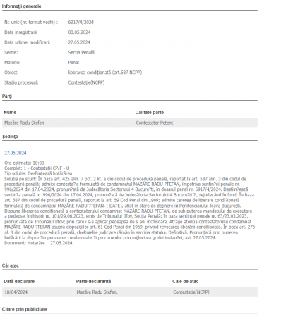 Radu Mazăre iese din închisoare la 5 ani de la extrădarea sa din Madagascar. Tribunalul Ilfov i-a aprobat cererea de eliberare condiționată, iar decizia este definitivă. Fostul primar al Constanței ispășea o pedeapsă de 9 ani primiți în dosarul retrocedărilor fictive. El a mai fost condamant la 5 ani de închisoare în februarie 2022 în dosarul Polaris.