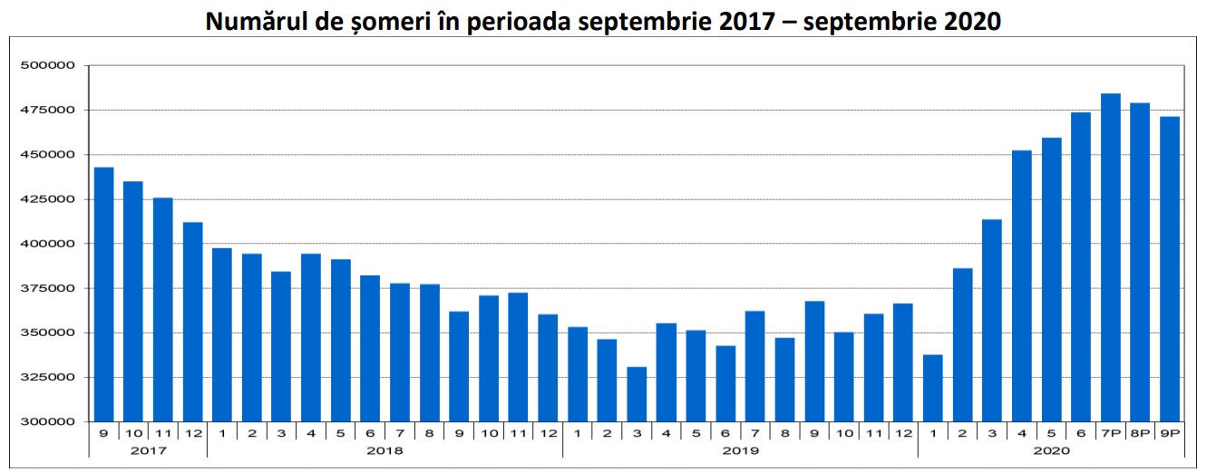 Astfefl, pe fondul reluării treptate a activităților, numărul șomerilor (în vârstă de 15-74 ani) estimat pentru luna septembrie a anului 2020 s-a redus la 471 mii persoane, față de 479 mii persoane.