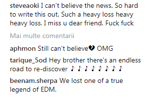 „Nu pot să cred! Mi-e atât de greu să scriu… O pierdere uriașă, uriașă, uriașă pierdere. O să-mi lipsești, drag prieten! ” Steve Aoki