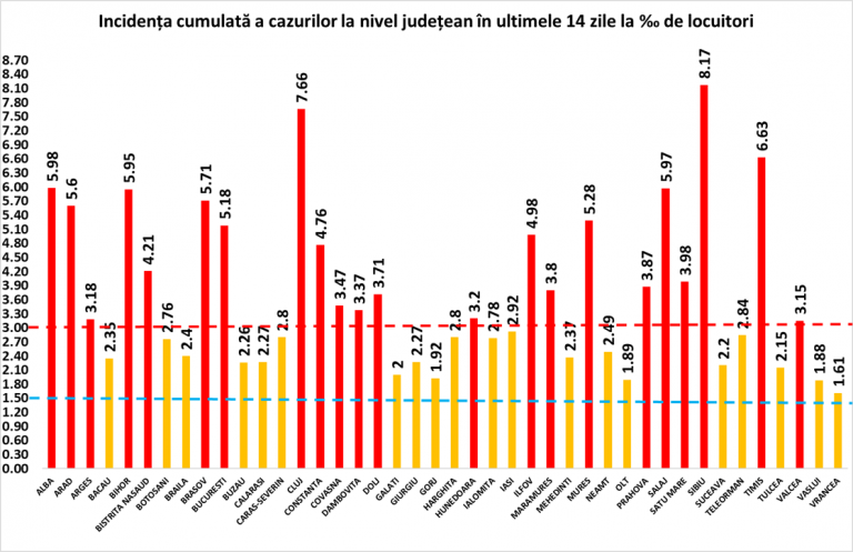 Coeficientul infectărilor cumulate la 14 zile, raportate la 1.000 de locuitori este calculat de către Direcțiile de Sănătate Publică, la nivelul Municipiului București și al județelor. Mai jos aveți graficul realizat în baza raportărilor primite de CNCCI de la Direcțiile de Sănătate Publică: