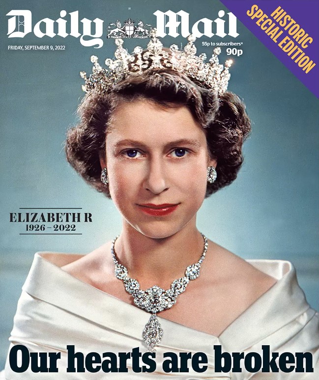 „Inimile noastre sunt frânte”, scrie și Daily Mail pe prima pagină, acolo unde se află și portretul Reginei din 1952, pe vremea când încă era prințesa Elisabeta.