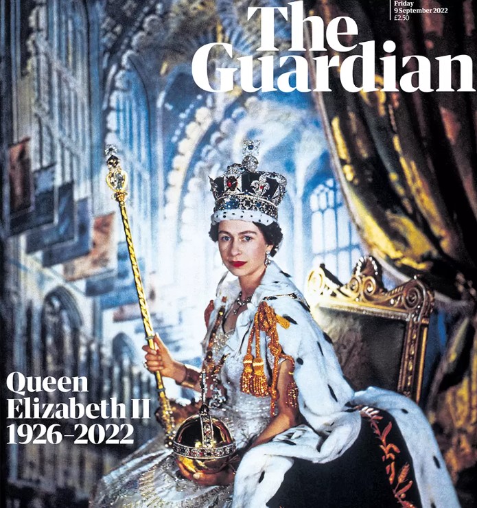 Mai multe publicații din Marea Britanie, printre care și The Guardian, au ales să publice pe prima pagină o fotografie cu Regina la începutul domniei sale.