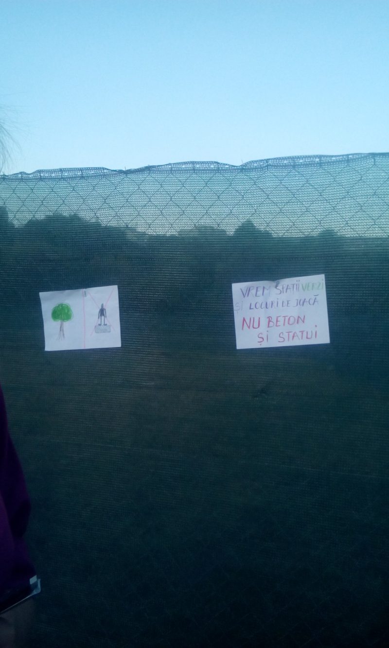 În semn de protest, copiii au scris mesaje pe care le-au agățat de gardul șantierului.