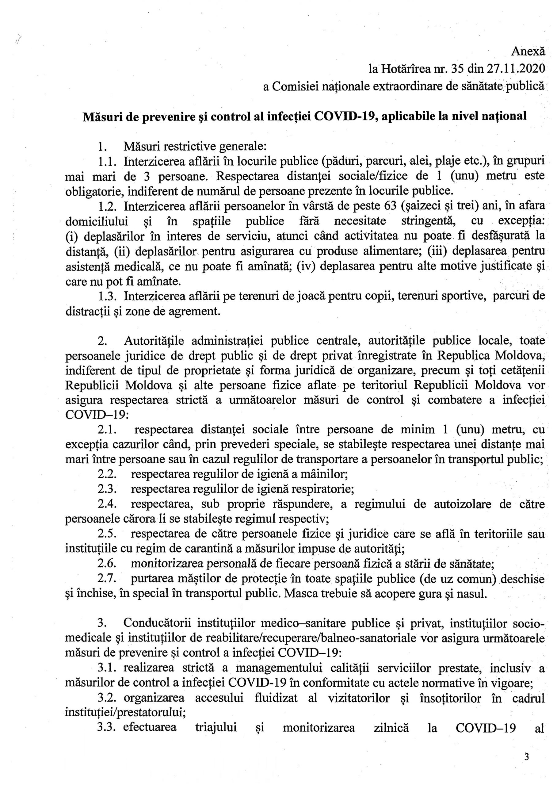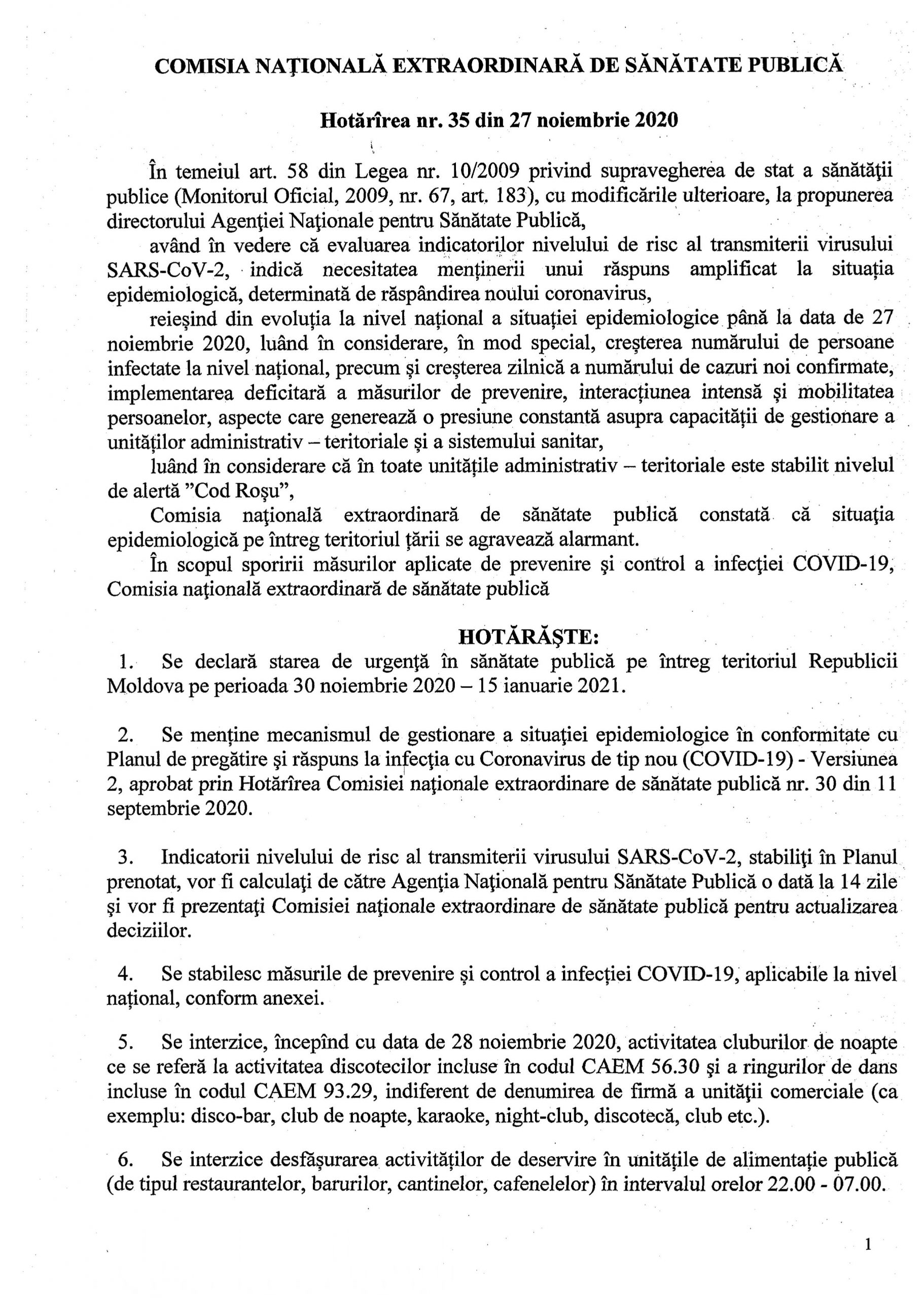 Hotărârea nr. 35 din 27 noiembrie 2020 COMISIA NAȚIONALĂ EXTRAORDINARĂ DE SĂNĂTATE PUBLICĂ
