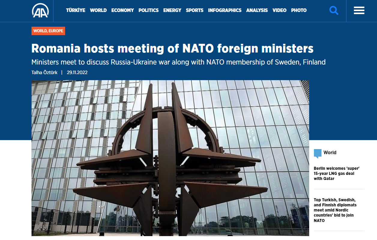 „Miniștrii de Externe ai NATO participă, începând de marți, la o reuniune de două zile în capitala României, București. Miniștrii urmează să discute despre războiul din Ucraina, considerat o amenințare la adresa păcii și securității euro-atlantice. Secretarul General al NATO, Jens Stoltenberg, a declarat, înaintea reuniunilor, că președintele rus Vladimir Putin încearcă să folosească iarna ca armă împotriva Ucrainei și că Rusia ar putea continua să atace rețeaua electrică ucraineană și infrastructura de gaze naturale”, scrie Anadolu Agency.