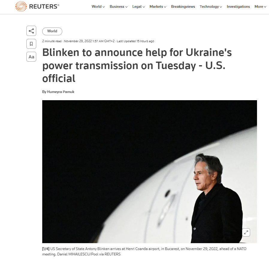 „Secretarul de stat al SUA, Antony Blinken, va anunța marți o nouă asistență pentru a ajuta la restabilirea capacității de transmisie a energiei electrice a Ucrainei în fața atacurilor rusești care vizează rețeaua energetică a țării, a declarat un oficial de rang înalt al Departamentului de Stat. Blinken a sosit în România luni seara, înaintea unor întâlniri cu aliații din NATO și cu miniștrii de externe din Grupul celor șapte economii avansate”, scrie Reuters.