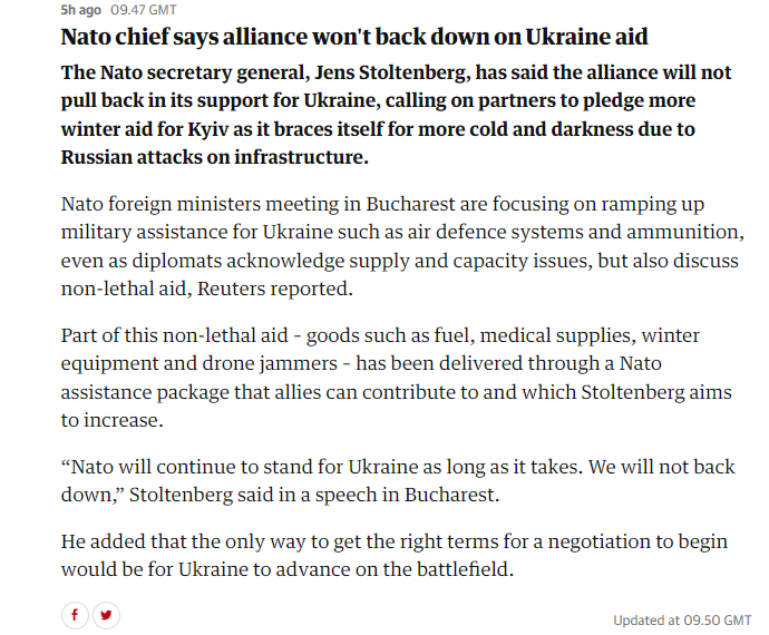 „Secretarul General al NATO, Jens Stoltenberg, a declarat că Alianța nu va renunța la sprijinul acordat Ucrainei, solicitând partenerilor să promită mai mult ajutor pe timp de iarnă pentru Kiev, care se pregătește pentru mai mult frig și întuneric din cauza atacurilor rusești asupra infrastructurii.