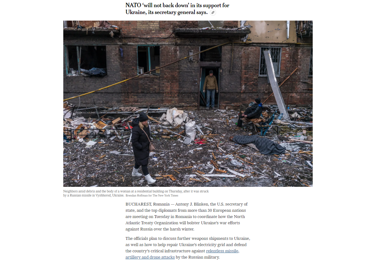 „Antony J. Blinken, secretarul de stat american, și diplomații de top din peste 30 de națiuni europene se întâlnesc marți în România pentru a coordona modul în care NATO va sprijini eforturile de război ale Ucrainei împotriva Rusiei în timpul iernii aspre.