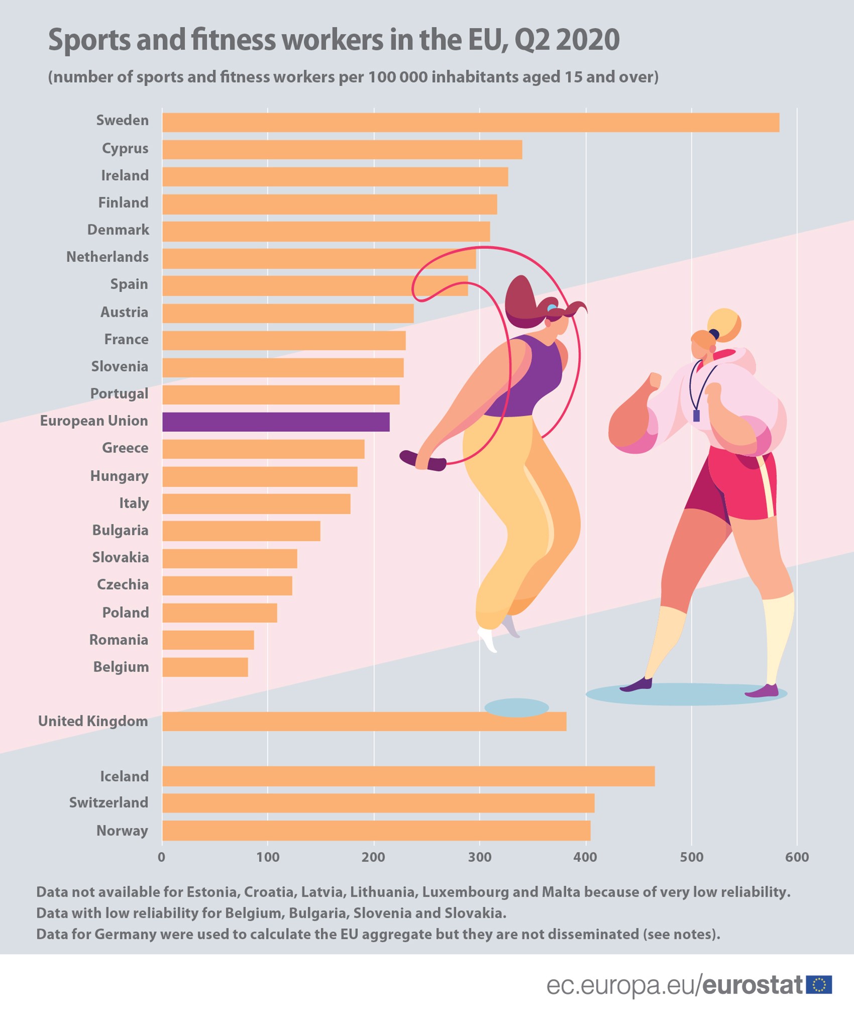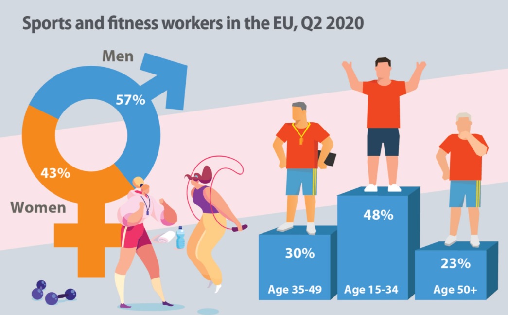În cel de-al doilea trimestru al anului 2020, 801.700 de persoane din UE, cu vârsta de peste 15 ani, erau angajate în sectorul sportului și fitnessului, adică un total de 0,4% din totalul locurilor de muncă.