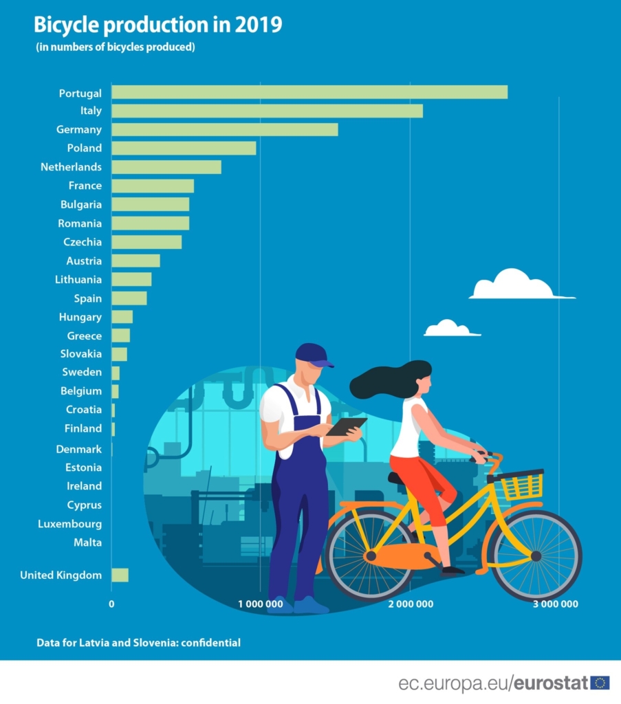 Dintre statele membre, Portugalia a fost cel mai mare producător în 2019, cu peste 2 milioane şi jumătate de biciclete. Este urmată de Italia (2,1 milioane), Germania (1,5 milioane), Polonia (0,9 milioane) și Olanda (0,7 milioane). Aceste cinci țări au reprezentat împreună 70% din producția totală de biciclete din UE în 2019.