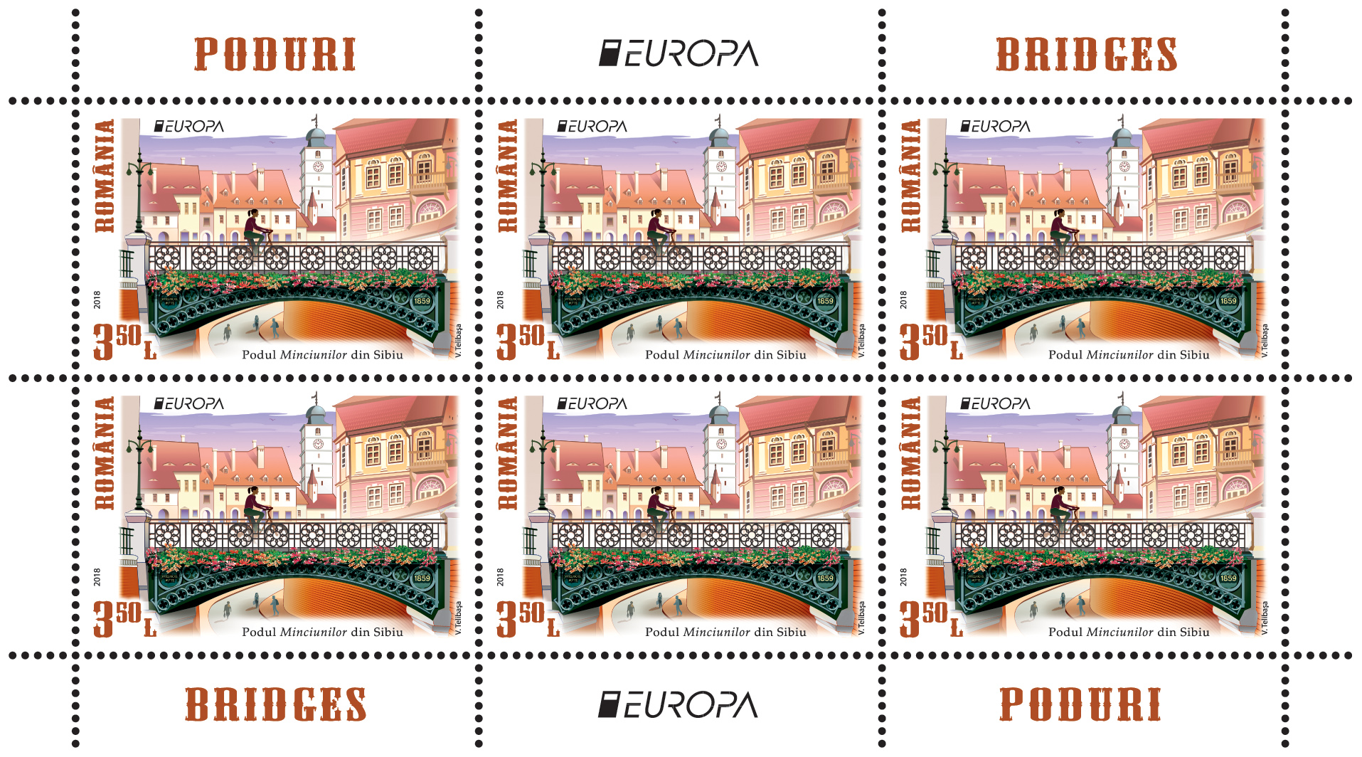 Emisiunea cuprinde două timbre. Primul are valoarea nominală de 3,50 lei ;i ilustrează Podul Minciunilor din Sibiu, iar pe cel de-al doilea timbru, cu valoarea nominală de 16,00 lei, este reprezentat Podul Anghel Saligny de la Cernavodă, judeţul Constanţa.