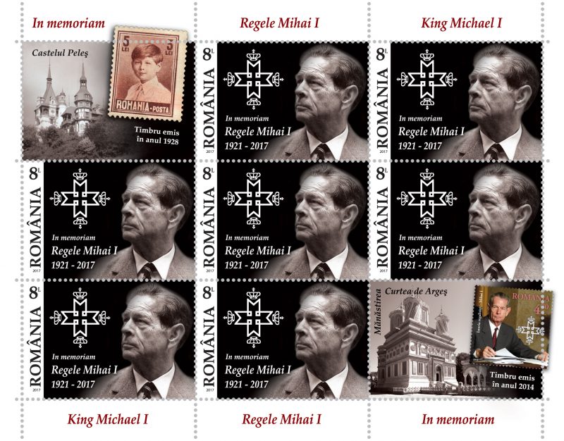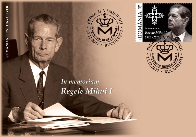 Romfilatelia introduce în circulaţie marca poștală “In memoriam, Regele Mihai I (1921-2017)”, miercuri, 13 decembrie 2017, cu valoarea nominală de 8 lei, ilustrând portretul şi monograma Regelui.