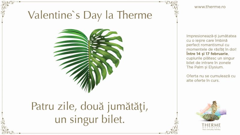 La Therme București vă puteți bucura de cea mai mare grădină botanică din România, cu peste 800.000 de plante, printre care 1.400 de palmieri și alte specii unicat. Iar între 14 și 17 februarie, vă puteți impresiona jumătatea cu o ieșire care combină romantismul și momentele de răsfăț în doi la Therme București! Vino cu perechea în zonele The Palm și Elysium și plătiți împreună un singur bilet de acces. Savurați împreună surprizele pregătite si, dacă doriți, vă puteți căsători pentru o zi! Dragostea e mai intensă după o sesiune de wellness în doi. Puteți trăi experiența unică de Couple Massage în Elysium, masajul cu Ulei Charme D’Orient, lumânări cu vanilie și ciocolată sau vă puteți distra și face sport în același timp la ședințele de Aqua Gym Couple.