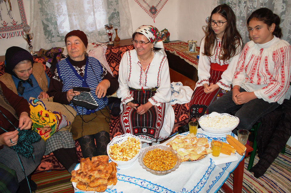 La fel ca pe vremuri le întâmpină pe femeile care vor țese carpete și ștergare până când se crapă de ziuă cu bucate tradiționale.
