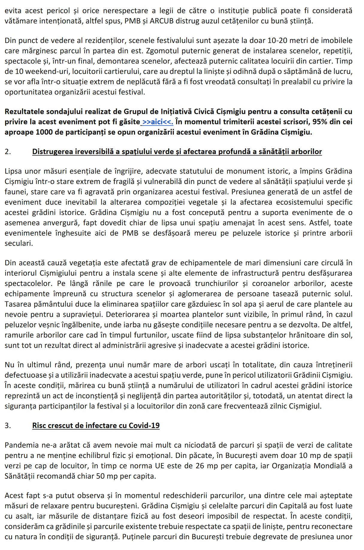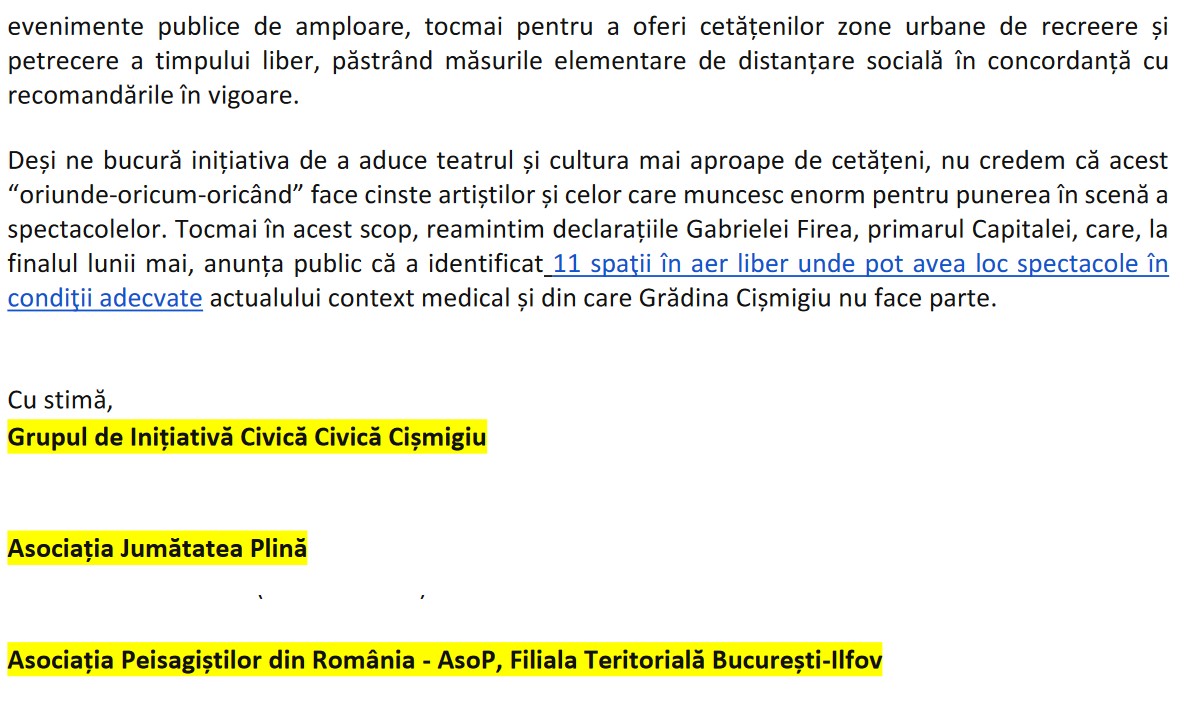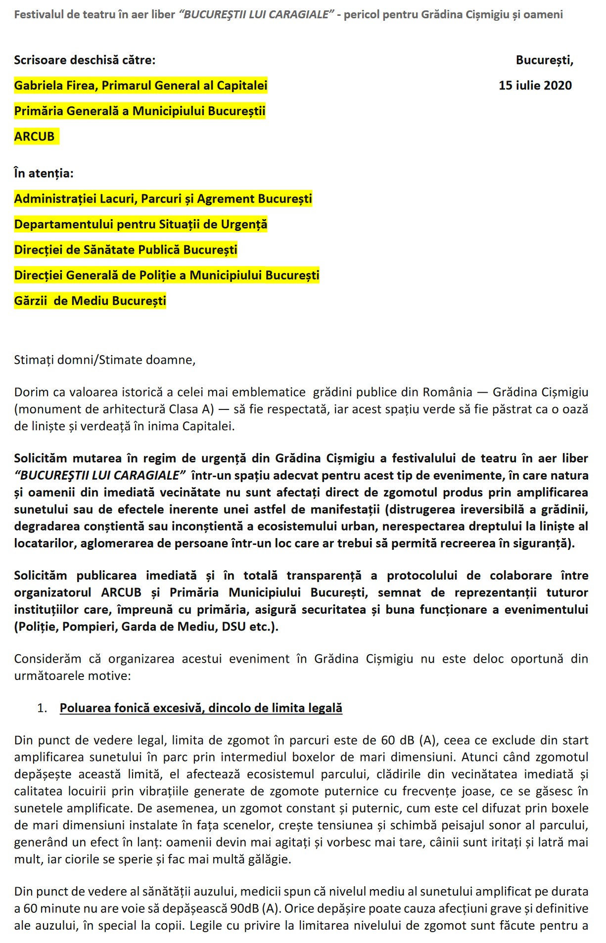 Grupul de Inițiativă Civică Civică Cișmigiu transmite Primăriei Capitalei, prin intermediul unei scrisoari deschise, pentru mutarea din Grădina Cișmigiu a festivalului de teatru stradal “Bucureștii lui Caragiale” .