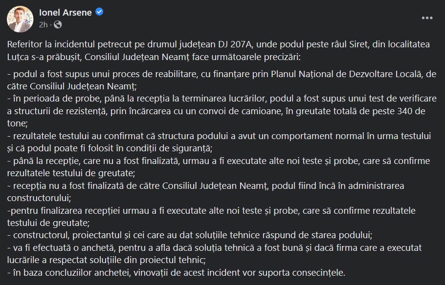 “Rezultatele testului au confirmat că structura podului a avut un comportament normal în urma testului și că podul poate fi folosit în condiții de siguranță. Până la recepție, care nu a fost finalizată, urmau a fi executate alte noi teste și probe, care să confirme rezultatele testului de greutate. Recepția nu a fost finalizată de către Consiliul Județean Neamț, podul fiind încă în administrarea constructorului. entru finalizarea recepției urmau a fi executate alte noi teste și probe, care să confirme rezultatele testului de greutate. Constructorul, proiectantul și cei care au dat soluțiile tehnice răspund de starea podului”, a adăugat social-democratul.