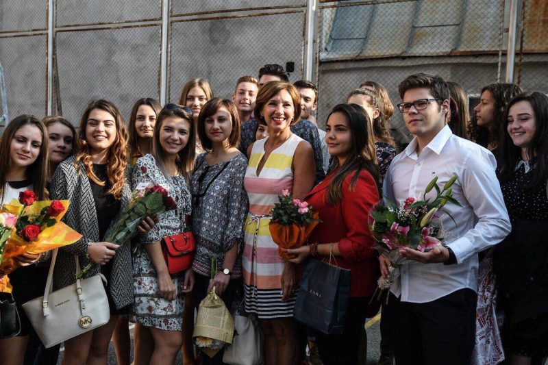 Ea a fost întâmpinată de directorul unităţii de învăţământ, Gabriel Negrea, după care a mers la clasa la care este dirigintă şi şi-a făcut un selfie cu elevii.