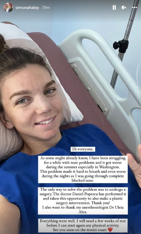 „Singura modalitate de a scăpa de aceste probleme, care nu mai permiteau o respirație corectă, era operația”, mai spune tenismena care a postat și o fotografie de pe patul de spital.