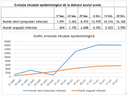 Situația epidemiologică din unitățile de învățământ preuniversitar, în data de 20 octombrie 2021, arată că sunt 16.168 de preșcolari și 5.590 de persoane din rândul angajaților în învățământ confirmați cu COVID-19.