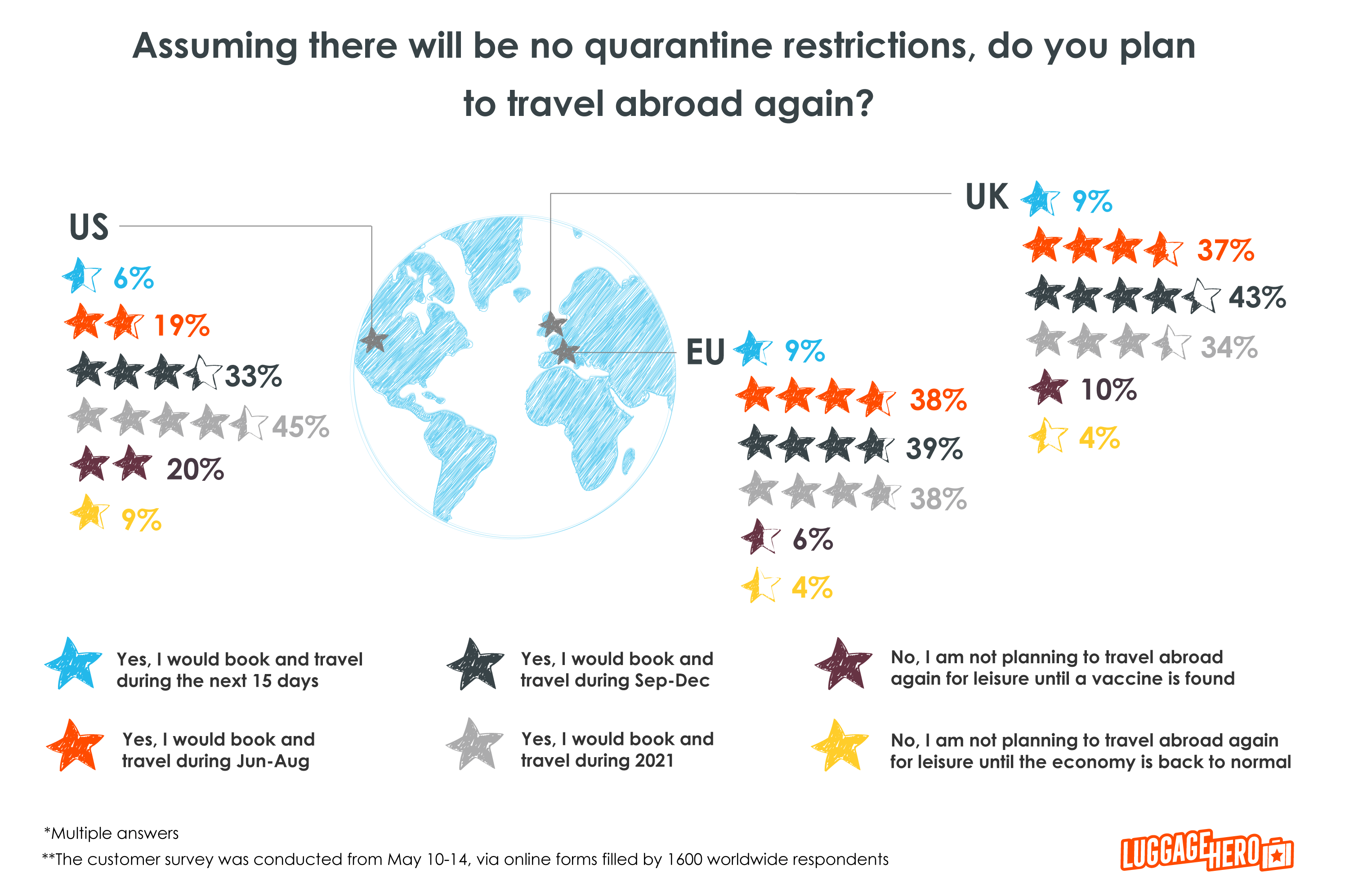 Mai mult de jumătate dintre europeni vor călători în lunile de vară, dar alți 20% sunt atât de dornici de plimbări încât vor porni la drum în primele 15 zile după ridicarea restricțiilor. În partea opusă, 3% au spus că nu vor să părăsească orașul în care locuiesc până nu vor avea acces la un vaccin iar un grup similar de 3% va aștepta revenirea economiei.
