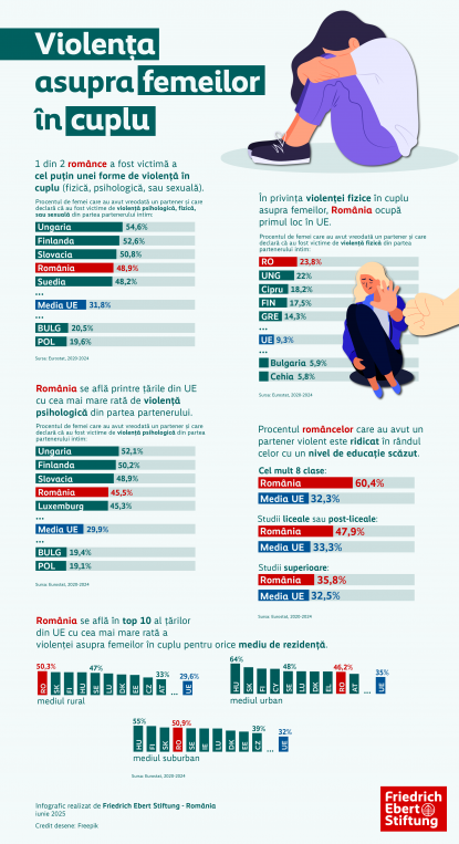 În România – arată datele oficiale – violența din partea partenerului este răspândită în toate mediile, indiferent de nivelul de educație, însă se regăsește în procent mai mare în mediul rural și în rândul celor cu educație mai scăzută.
