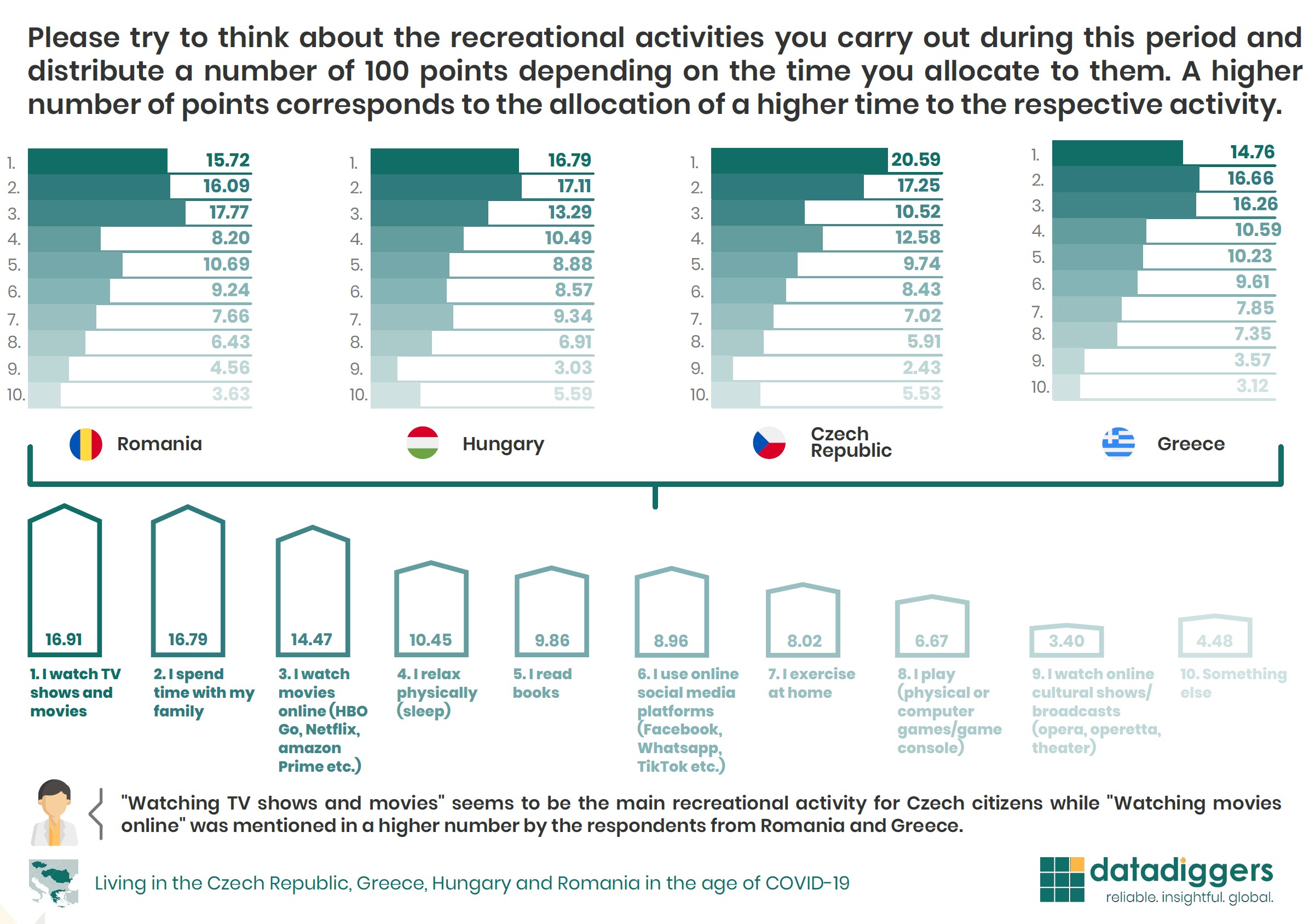 O analiză făcută de DataDiggers în România, Cehia, Grecia și Ungaria arată că în pandemie principalele trei modalități de relaxare au fost filmele și serialele online, privitul la TV și timpul petrecut cu familie. Procentele diferă ușor între țările analizate.