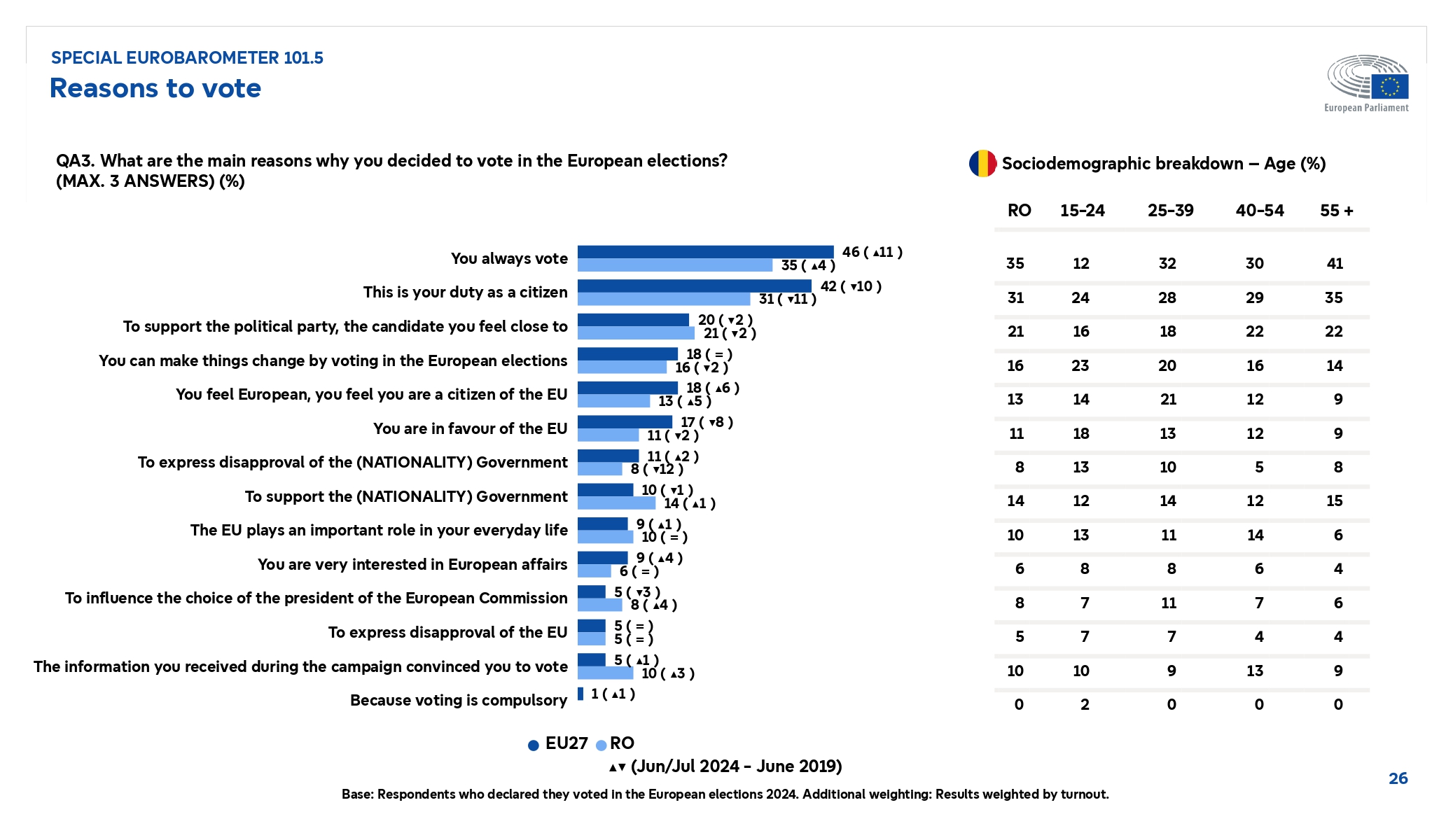 O treime dintre alegătorii din Uniunea Europeană – 34% – au fost motivați să meargă la vot de situația internațională, în timp ce 32% își motivează votul prin dorința de a apăra democrația și statul de drept.