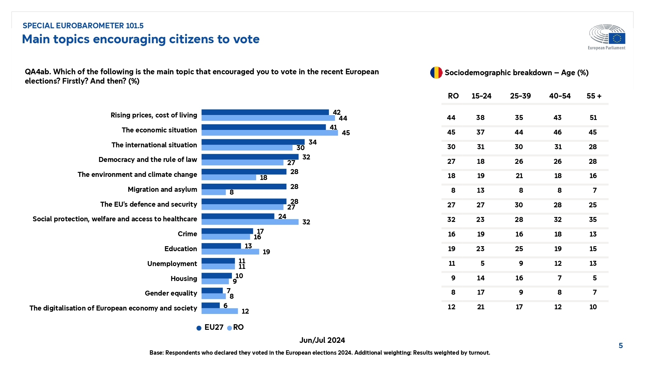 SONDAJ Eurobarometru după alegerile europarlamentare: Situația economică, creșterea prețurilor și a costului vieții, printre principalele motive pentru care au votat românii în iunie 2024 | DOCUMENT | INFOGRAFIC