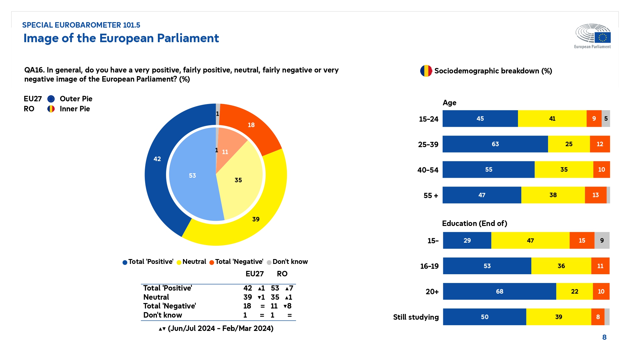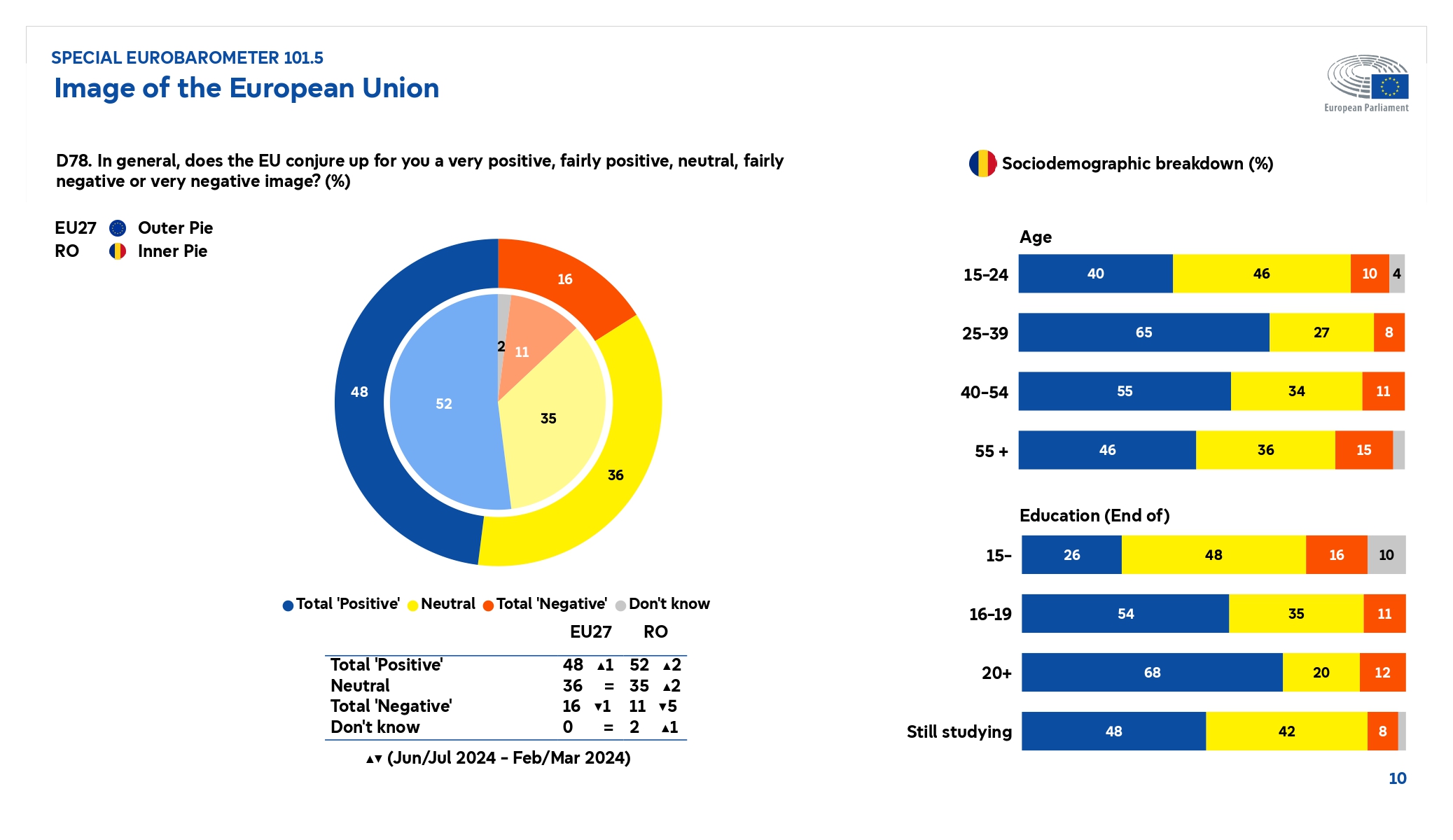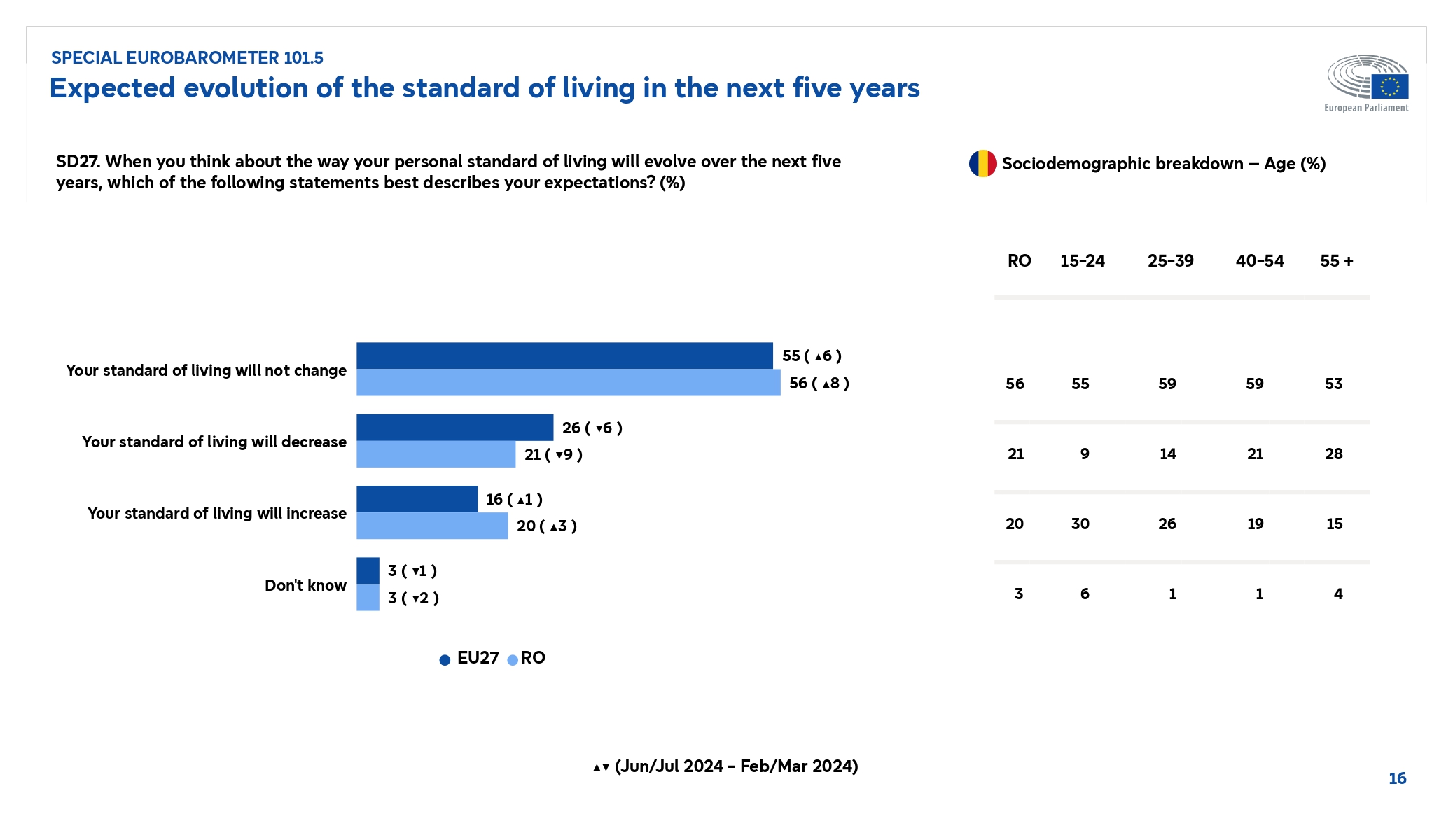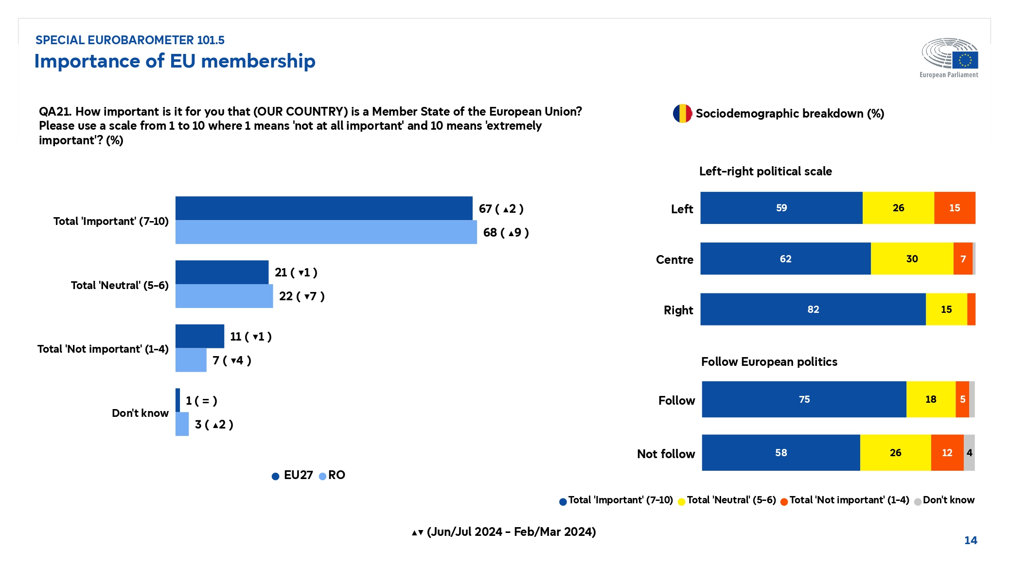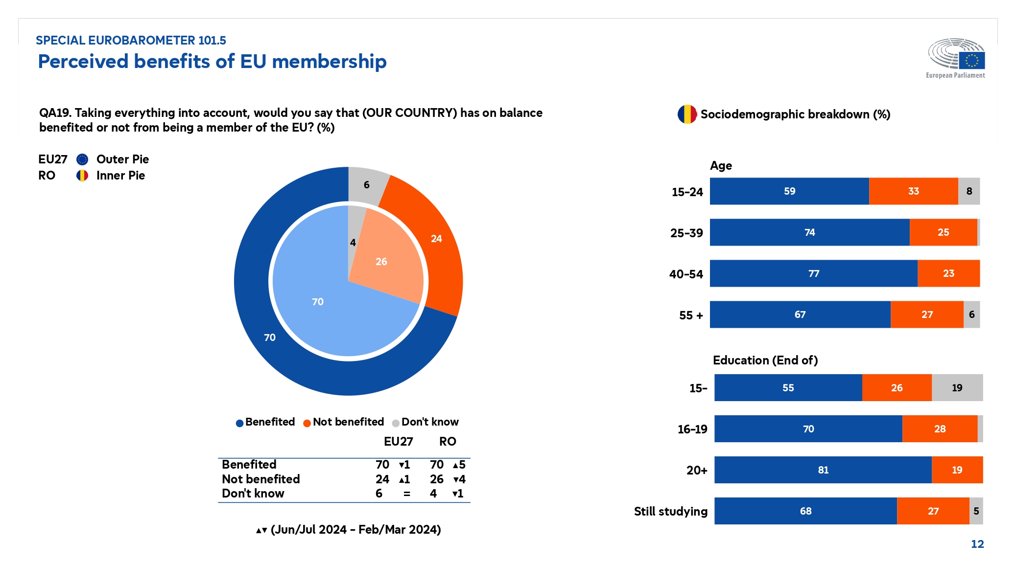 Parlamentul European a publicat sondajul Eurobarometru realizat după alegerile europarlamentare din iunie 2024. De ce au votat oamenii la alegerile europarlamentare din iunie 2024? Care este imaginea Parlamentului European și imaginea Uniunii Europene pentru cetățenii europeni? Care sunt beneficiile percepute ale statutului de membru al Uniunii Europene și cum văd europenii apartenența la Uniunea Europeană și care este evoluția preconizată a nivelului de trai din următorii 5 ani? Acestea sunt doar câteva întrebări pe care le urmărește sondajul Eurobarometru lansat de Parlamentul European pe 3 octombrie 2024.