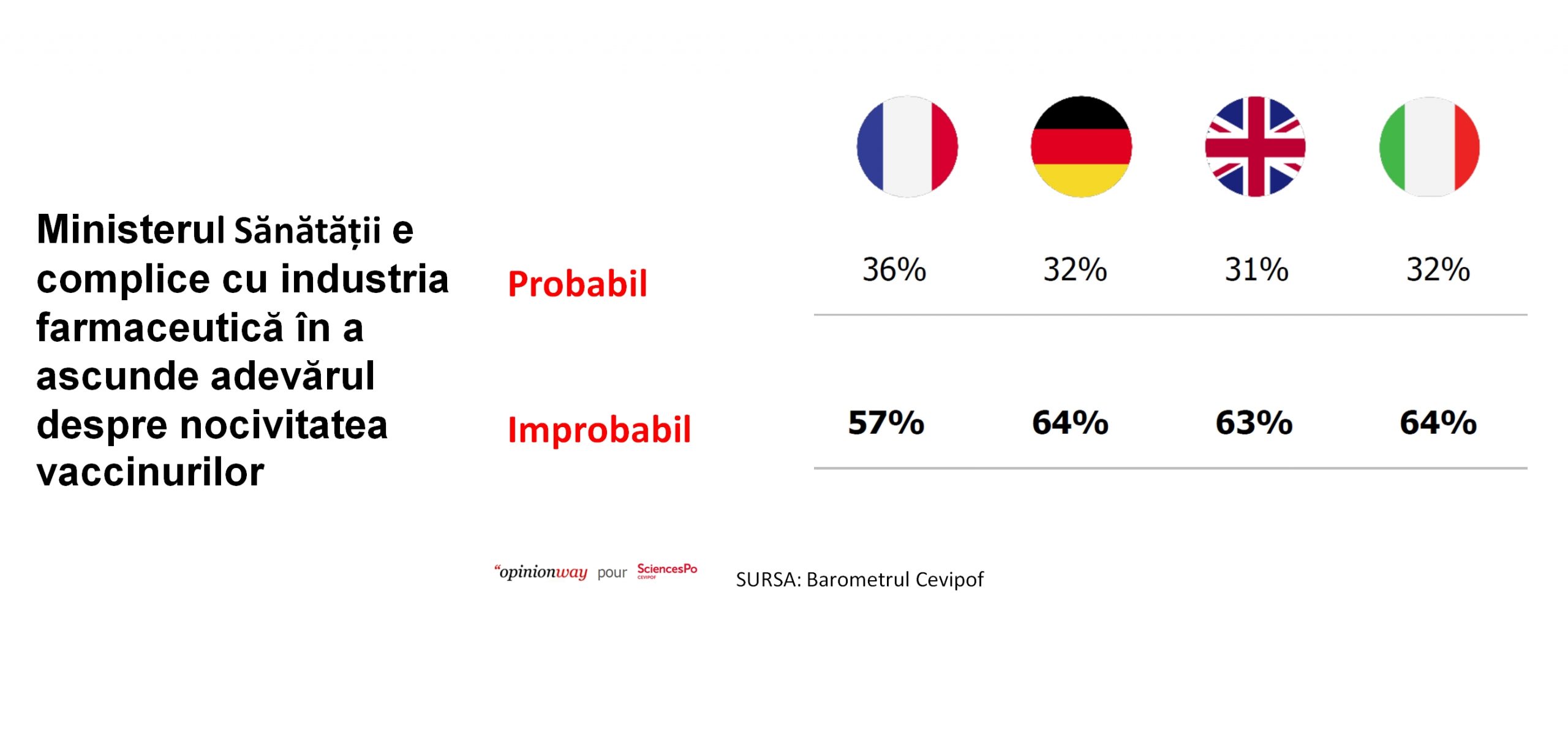36% dintre francezii intervievaţi cred că ministerul sănătăţii e în complicitate cu industria farmaceutică pentru a ascunde adevărul despre nocivitatea vaccinurilor. Aproape la fel de mare este nivelul de neîncredere în Germania şi Italia (32%), iar în Marea Britanie proporţia este de 31%.