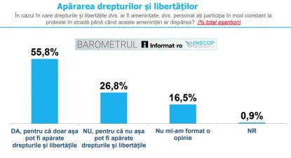 Barometrul mai arată și că 55,8 la sută dintre respondenți ar protesta în stradă pentru apărarea drepturilor și libertăților lor. Barometrul a fost efectuat la finalul lunii mai pe un eșantion de 1150 de persoane și are un grad de încredere de 95 la sută.