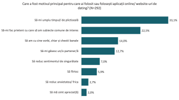 • Pentru a umple timpul/ din plictiseală – motiv selectat de 33% dintre respondenții care folosesc aplicațiile sau website-urile de matrimoniale