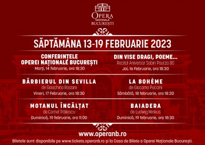 Cea de-a treia săptămână a lunii februarie aduce în fața publicului spectator al Operei Naționale București titluri de referință de operă „Bărbierul din Sevilla” de Gioachino Rossini, „La Bohème” de Giacomo Puccini, de balet „Baiadera” de Ludwig Minkus, spectacolul de operă pentru copii „Motanul Încălțat” de Cornel Trăilescu și recitalul de foaier „Din vise dragi, poeme…”.