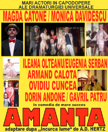 Comedia „AMANTA”, în regia lui Armand Calotă, este o adaptare după celebra lucrare „Încurcă lume” de A.D. Hertz.
