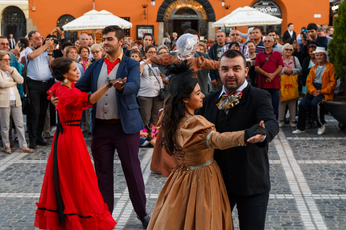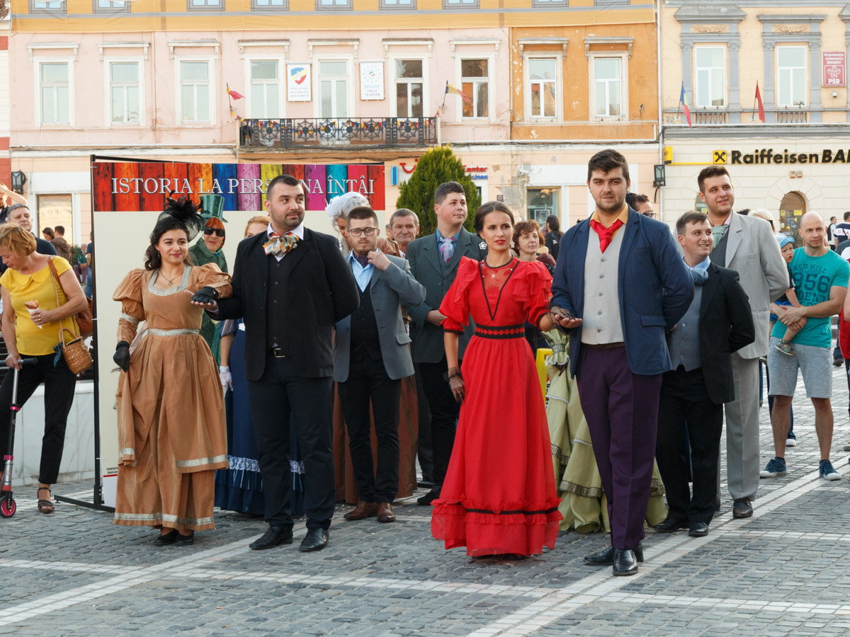 Caravana Marii Uniri a adus în Piața Sfatului din Brașov spectacolul ”Gold und Silber – muzica și dansurile Centenarului”, dedicat muzicii și dansului de acum 100 de ani.