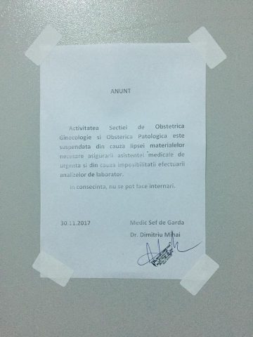 „Secția de ginecologie a fost suspendată – așa cum scrie chiar în ceea ce au pus medicii pe ușile întregului spital. Au spus „nu mai avem medicamente, nu mai putem face analize, nu mai aduceți pe nimeni pentru internare.