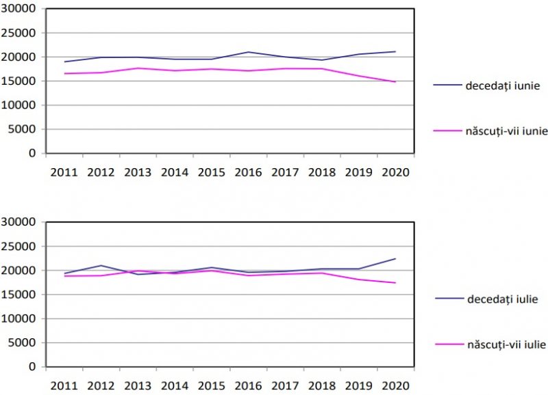 În luna iulie 2020 s-a înregistrat naşterea a 17.415 copii, cu 2.629 mai mulţi decât în luna iunie 2020. De asemenea, numărul deceselor înregistrate în iulie 2020 a fost de 22.417, cu 1.344 mai multe decât în luna anterioară.