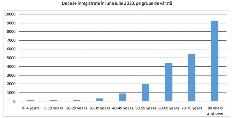Aproape două treimi din totalul numărului de decese (indiferent de motiv) s-au înregistrat la persoane cu vârstă de cel puţin 70 ani (9.220 decese, reprezentând 41,1% din total) şi 4372 decese (19,5%) la persoanele în vârstă de 60-69 ani.