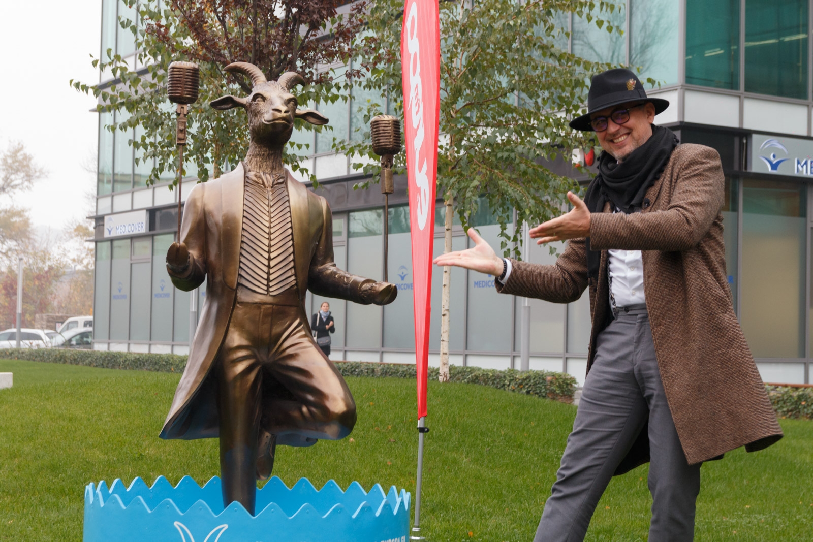 Statuia ”Trăiască capra vecinului” se află chiar în fața sediului Europa FM din Oregon Park, măsoară aproape 1,80m și reprezintă o capră cu două microfoane.