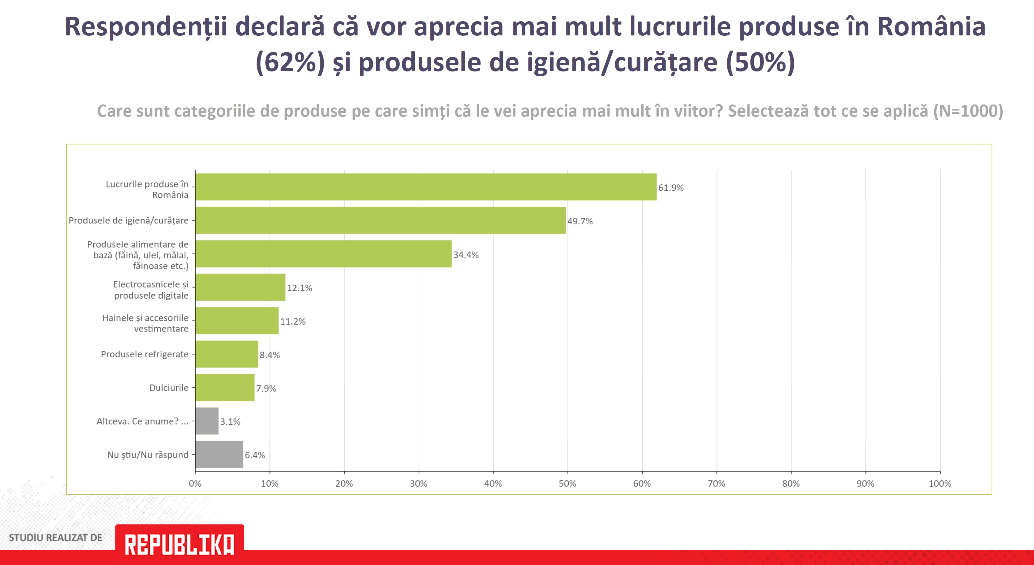 În privința obiceiurilor de consum, 60% din românii intervievați au declarat că vor susține mult mai mult în viitor producătorii locali de alimente. 30% vor cumpăra mai mult online în viitor produse de igienă și îngrijire personală, cât și pentru curățenie.