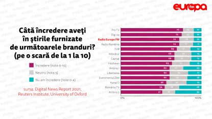 Europa FM conduce în clasamentul brandurilor de încredere, cu o cotă de încredere de 72%, alături de Pro TV (76%) şi Digi 24 (75%), potrivit studiului Digital News Report realizat de Reuters Institute şi University of Oxford în 46 de ţări din toată lumea. Topul este completat de radioul şi televiziunea publice.
