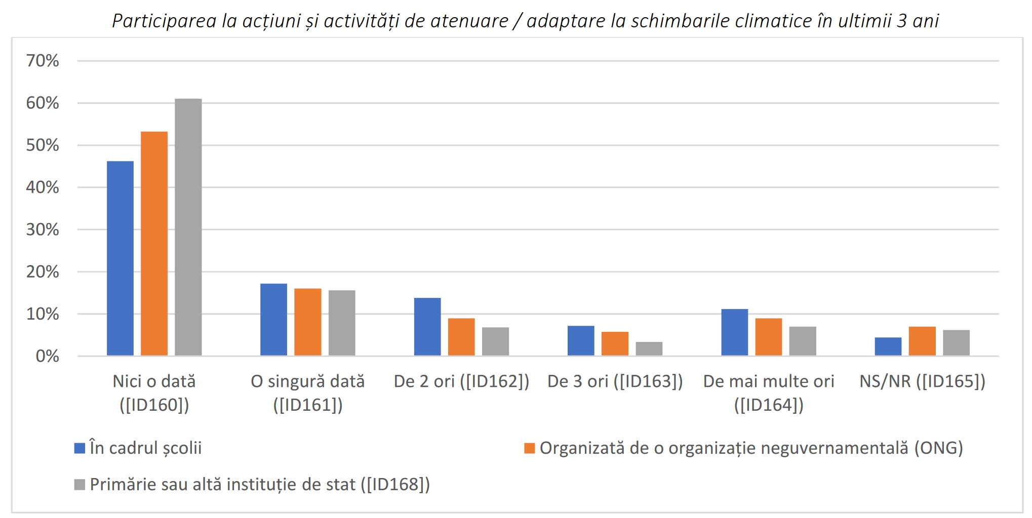 Referitor la implicarea tinerilor în activități legate de mediu, aproape 50% dintre respondenți au participat la activități organizate în cadrul școlii, 40% au participat la astfel de activități organizate de organizații neguvernamentale, iar aproximativ 34% dintre respondenți au participat la activități de atenuare / adaptare la schimbările climatice organizate de primării sau alte instituții de stat.