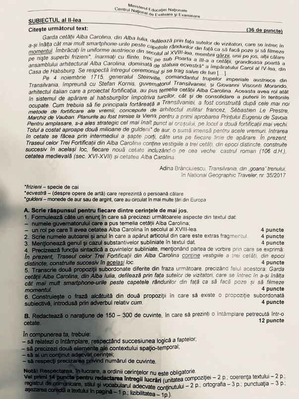Al doilea subiect a avut și el ca cerință, printre altele, realizarea unei narațiuni în care absolvenții de gimnaziu să prezinte “o întâmplare petrecută într-o cetate”.
