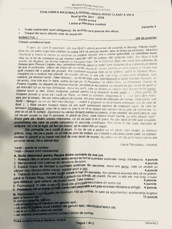 La primul subiect, elevii au avut de realizat o compunere de minimum 150 de cuvinte, în care să argumenteze apartenența la genul epic a unui text din romanul “Inocenţii” de Ioana Părvulescu.