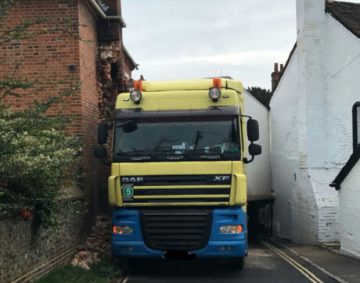 Un camion cu numere româneşti a reuşit să rămână înţepenit între două case din Anglia (AUDIO)