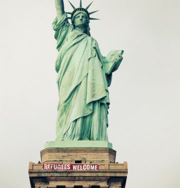 Un banner pe care scria ”Refugees Welcome” a fost agăţat de Statuia Libertăţii din New York