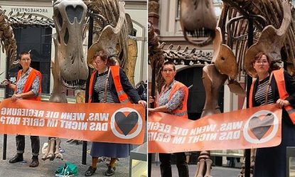 Germania: Două activiste de mediu s-au lipit de stâlpii ce susțin scheletul unui dinozaur. Protestau împotriva politicii în domeniul climei | VIDEO