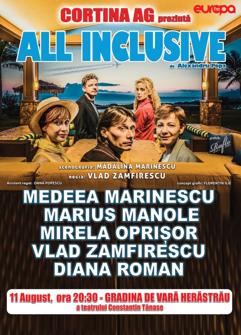 Comedia “All Inclusive” se joacă din 2017, cel mai adesea cu sala plină. Acţiunea gravitează în jurul familiei formate din Maurice (Marius Manole), Margaret (Medeea Marinescu) şi fiica lor Adele (Diana Roman).