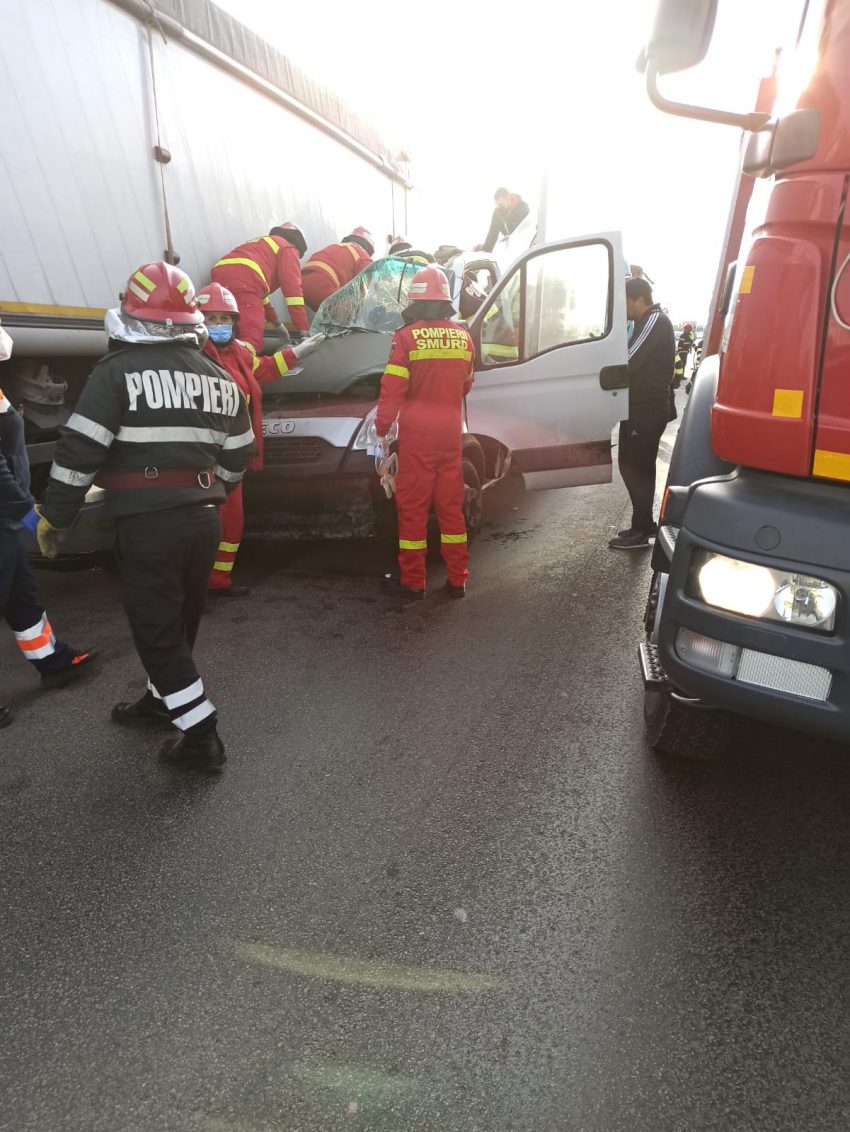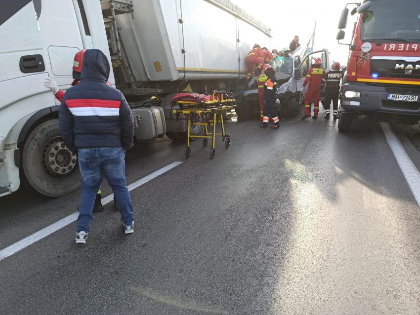 Pasagerul din dreapta, tatăl șoferului care conducea duba, a murit după ce duba în care se afla a fost prinsă între două TIR-uri, în urma unei șicanări în trafic.