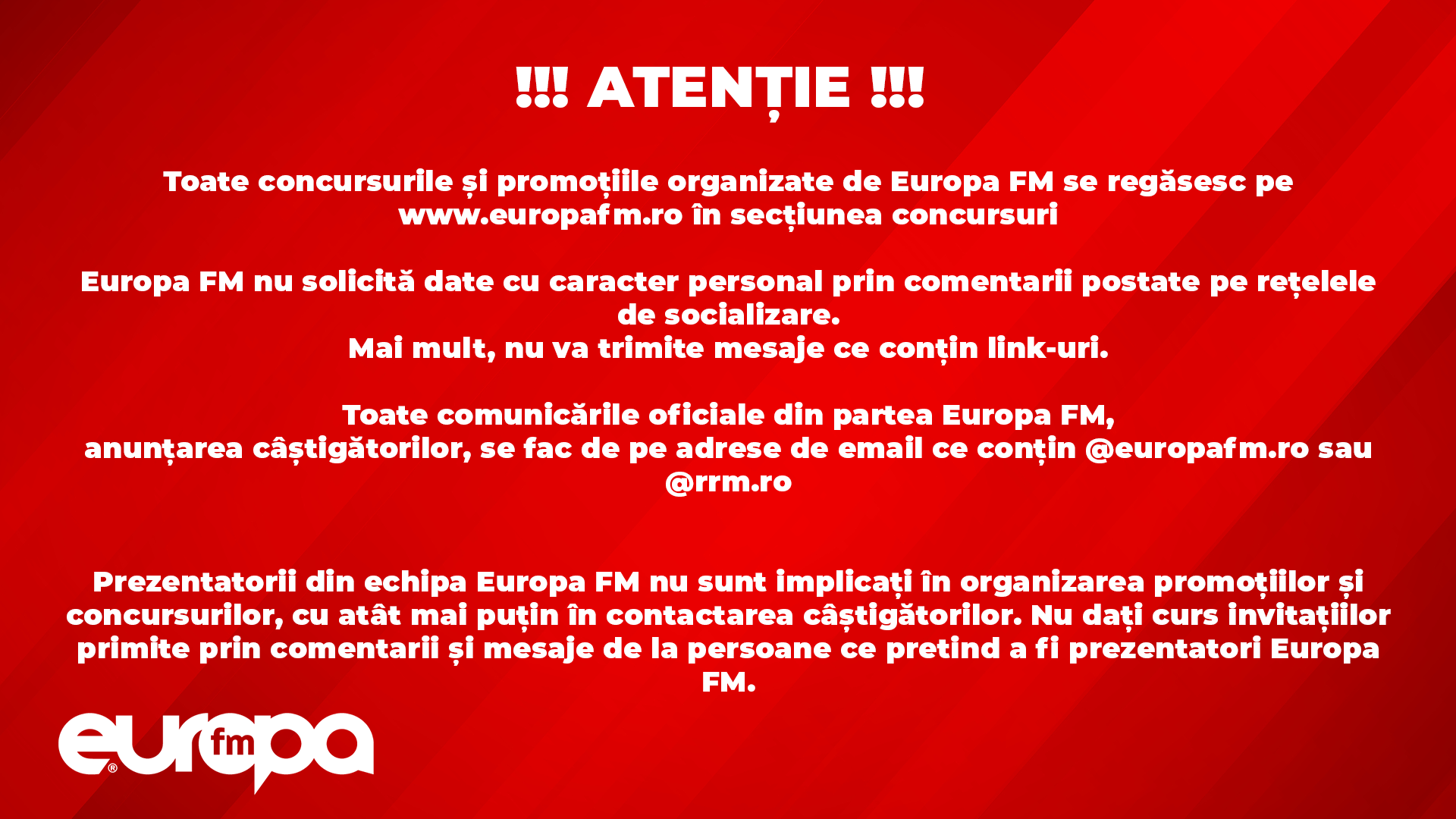 Moderatorii din echipa Europa FM nu sunt implicați în organizarea promoțiilor și concursurilor, cu atât mai puțin în contactarea câștigătorilor. Nu dați curs invitațiilor primite prin comentarii și mesaje de la persoane ce pretind a fi moderatori Europa FM.